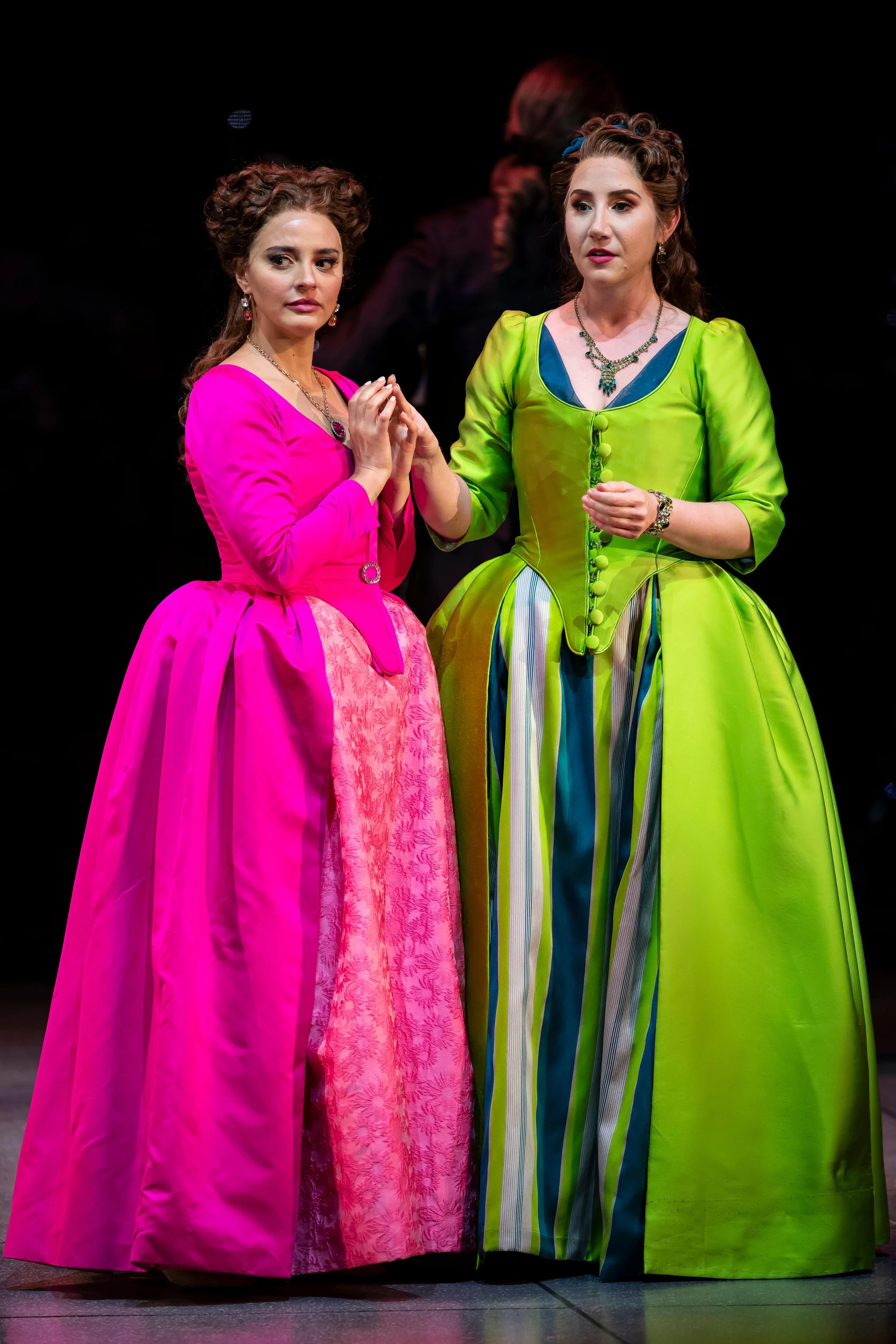 “Designer Lynly Saunders delivers. She’s costumed the two lead female roles, a pair of young sisters, Fiordiligi and Dorabella, in palest of pistachio green and cherry blossom pink, all ruffles and lace, two pictures of virtuous pulchritude. Some scenes later, and having tasted the headiness of desire, they reappear in drenched gold-green (Fiordiligi) and shocking magenta-pink (Dorabella). One wants to lick the creampuff skirts of Act I and dive into the rich silk gorgeousness in Act II. The girls’ male counterparts look eager to do the same.