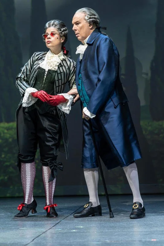 Saunders refreshes Ferrando and Guglielmo, the young ladies’ suitors, transforming from brightly colored silly nutcracker soldiers, be-ribboned, sashed, and all saber-rattling to hirsute Albanian gypsies, their locks flowing and their garments richly embroidered.
